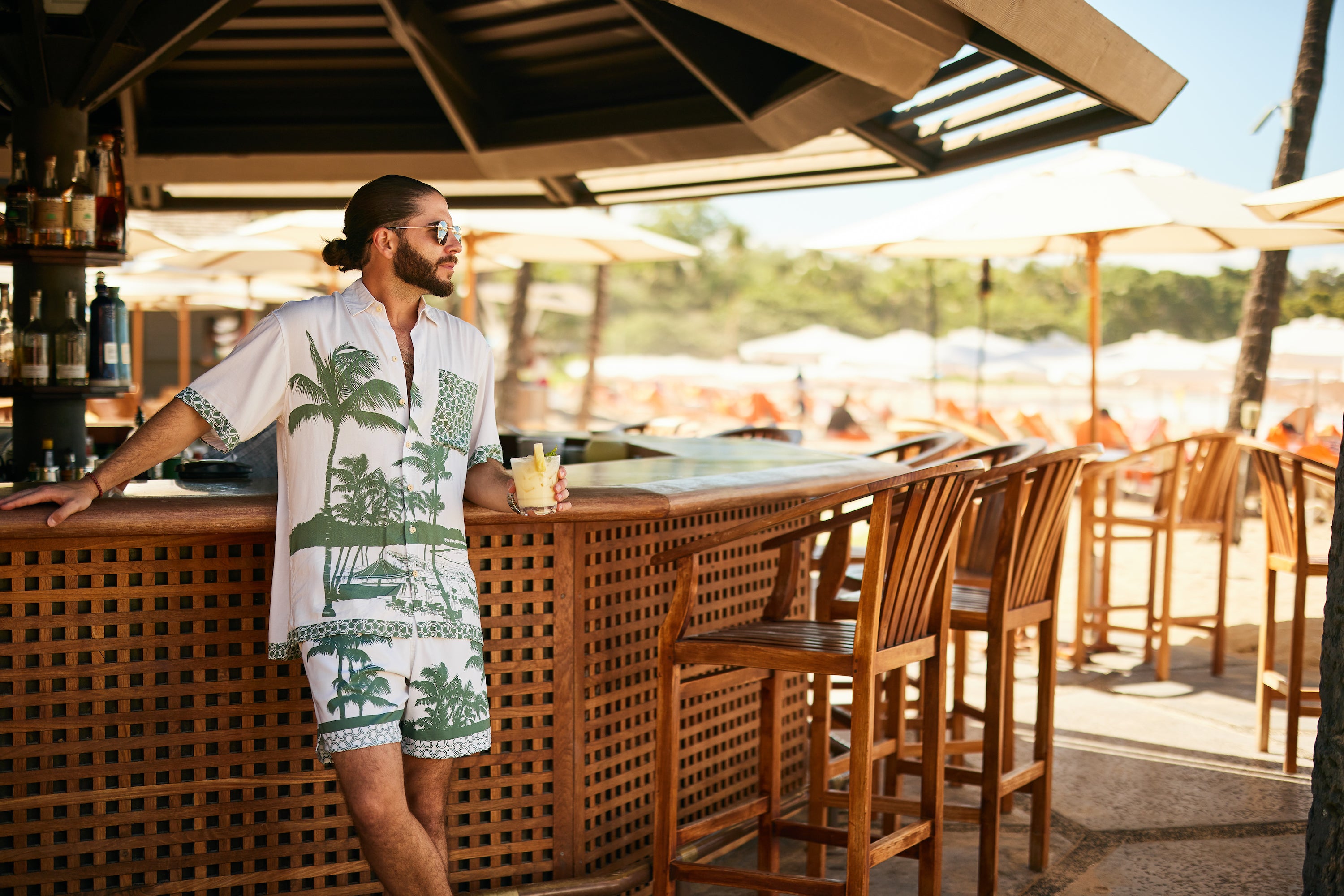 These matching swim trunks and Hawaiian shirt cabana sets are inspired by the retro 1960s pool parties and Miami beach days that Kenny's grandparents used to take in Florida. Kenny's Nana was the one who first came up with the mens matching shirt and shorts KF cabana set idea. Although she describes it as "a little bit much", we think it's just right.
